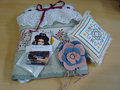 Ela queria fazer uma árvore de Natal com cartões do mundo inteiro e quem enviasse um cartão estaria concorrendo a kits da sua Escola de Bordados e eu fui uma das premiadas, uau a primeira.